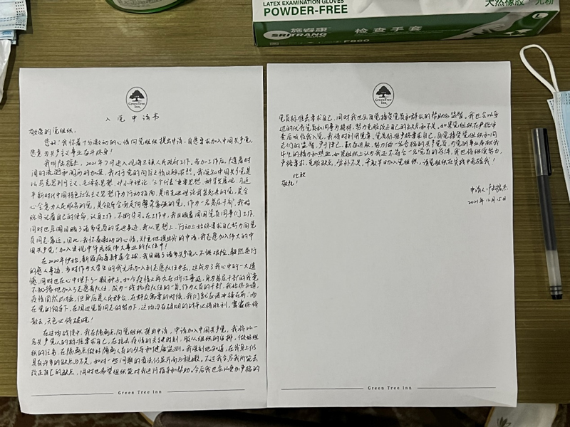 手寫入黨申請書。觀海衛鎮供圖