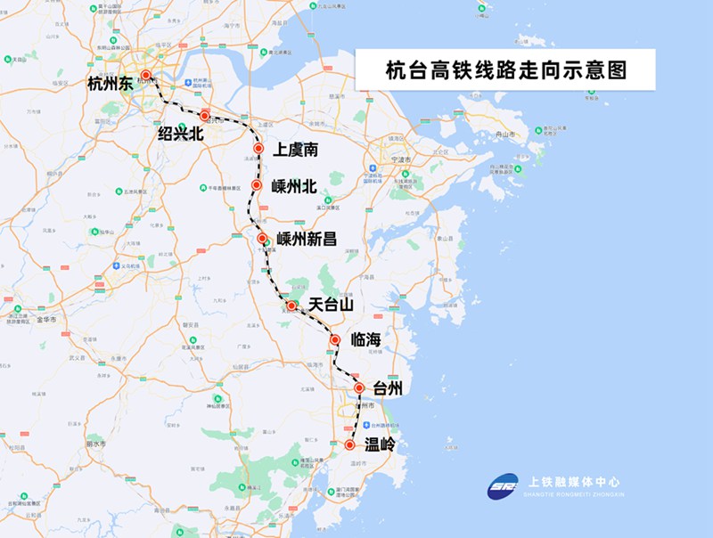 “杭臺高鐵連接浙江省杭州、紹興、臺州三市,北起杭州東站,杭州至紹興段利用既有杭深高鐵杭甬段,新建杭臺高鐵紹興至臺州段線路從紹興北站引出,經紹興市越城、上虞、嵊州、新昌和臺州市天臺、臨海、椒江、路橋、溫嶺等縣區,引入既有杭深高鐵溫嶺站!睋冀B臺鐵路有限公司相關負責人介紹,杭臺高鐵全線266公里,設計時速350公里,設紹興北、上虞南、嵊州北、嵊州新昌、天臺山、臨海、臺州、溫嶺8個車站,其中紹興北、臨海、溫嶺為既有站。