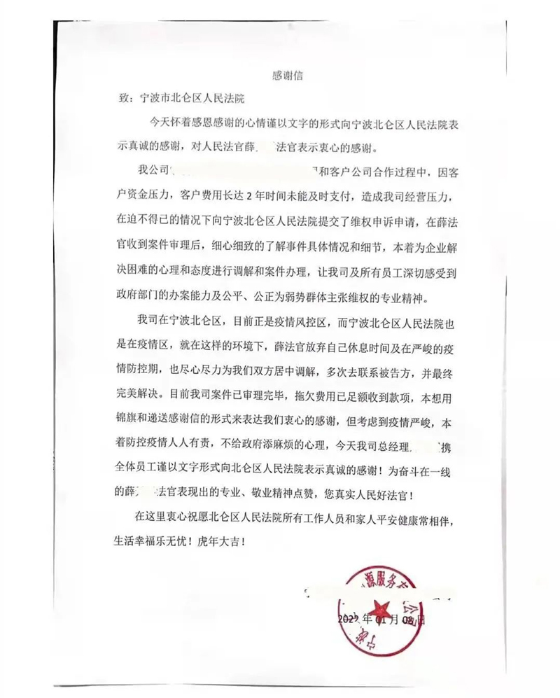 “今天懷著感恩感謝的心情謹以文字的形式向寧波北侖區人民法院表示真誠的感謝……”1月8日,北侖法院執行局收到了該企業的感謝信,感謝執行法官投身抗疫仍執行不停,幫助公司追回20余萬元解決了燃眉之急。