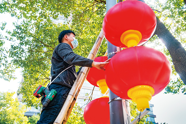1月14日,在金華市區李漁路上,工作人員在道路兩側懸掛大紅燈籠。據介紹,金華市區婺州街、雙溪西路、賓虹路、八一南街、環城西路等道路,以及金華金義新區光南路、東寧路、金甌路、康濟街等多條道路兩側在春節前都將掛上紅燈籠,給新春佳節增添歡樂喜慶的氛圍。(時寬兵)
