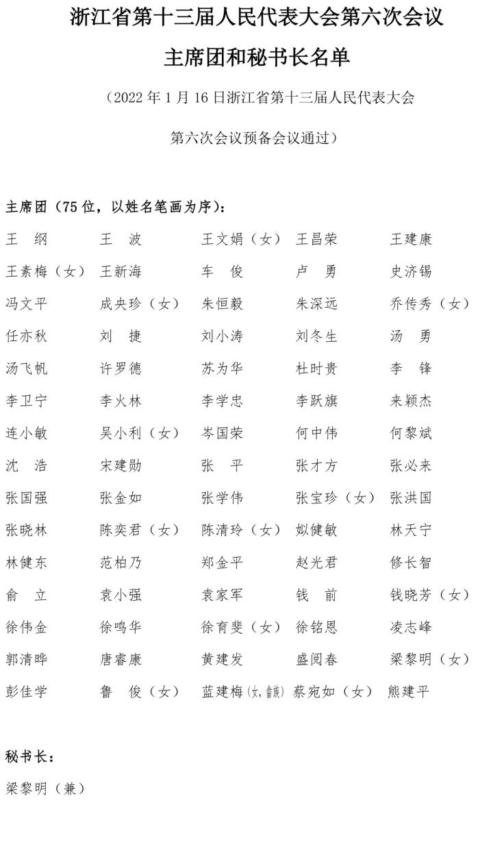 浙江省十三屆人大六次會議主席團和秘書長名單