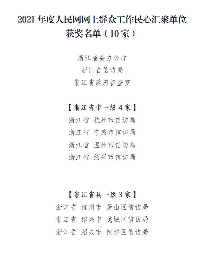 浙江省“2021年度人民網網上群眾工作民心匯聚單位”出爐