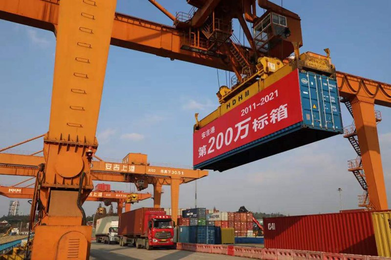 安吉港是省內重要的內河國際集裝箱碼頭,也是長三角地區首個千噸級內河支線港口,自2011年以1.2萬標箱開港以來,吞吐量保持穩定增長。安吉港連接以上海為核心的長三角、皖南及浙西北的物流樞紐效應進一步凸顯。2021年12月1日,隨著第200萬標箱貨柜進艙,標志著安吉港集裝箱吞吐量突破200萬標箱,安吉港也成為全省第一個突破200萬標箱的內河港口。安吉上港國際港務有限公司總經理助理黃萱磊表示,目前安吉港已與多個共建“一帶一路”國家實現了貿易互通,與全球1000多個港口和地區實現了通達。
