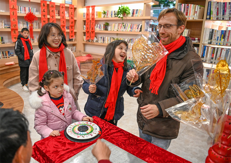“詩句有云,歲暮方思媚灶王,香瓜元寶皆麥糖。粘口何須多如此,買顆先命小兒嘗。送糖瓜,祭灶神是傳統的小年民俗……”在賞析分享了傳統春節習俗詩歌后,國際友人和僑鄉的“洋娃娃”們在主持人的帶領下一起體驗了一把詩句中描繪的傳統年俗。在這一環節,糖畫攤上的濃郁甜香和糖畫傳承人蔣師父手下畫出的一個個惟妙惟肖的糖畫,引得現場的國際友人和“洋娃娃”們一個個圍在攤位前,挪不動腳步。