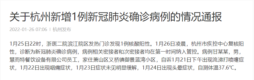 1月25日22時,浙醫二院濱江院區發熱門診發現1例核酸陽性。1月26日凌晨,杭州市疾控中心復核陽性,診斷為新冠肺炎確診病例,病例相關密接者和次密接者均在第一時間納入管控。病例甘某某,男,慧而特餐飲設備有限公司員工,家住蕭山區義橋鎮御景藍灣小區,自訴1月21日下午出現流涕打噴嚏癥狀,1月22日出現咽痛癥狀,1月23日癥狀未見明顯緩解,1月24日出現頭暈癥狀,自測體溫37.6℃。