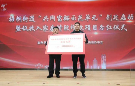 1月27日下午,嘉興桐鄉市梧桐街道舉行“共同富裕示范單元”創建啟動暨低收入家庭持股增收項目分紅儀式,浙江大學社會治理研究院、浙江工商大學社會科學研究院2家高校的首個共同富裕研究基地也正式揭牌落戶。