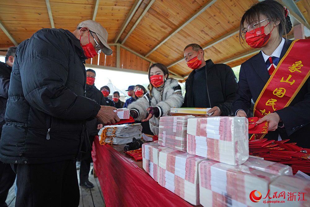 “分紅嘍!”9點一過,隨著村黨支部書記丁道理的一聲吆喝,銀行工作人員將成捆的現金按股份分到了村民們的手中。拿到紅包的村民們相互“攀比”起來,臉上洋溢著幸福的笑容。