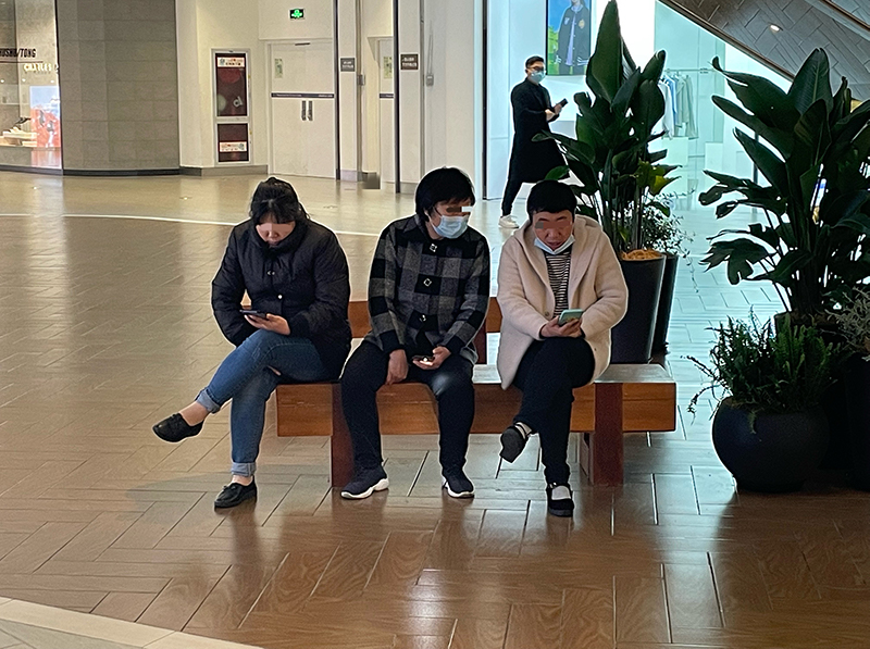顧客們摘下口罩在商場內聊天。孫正祈攝