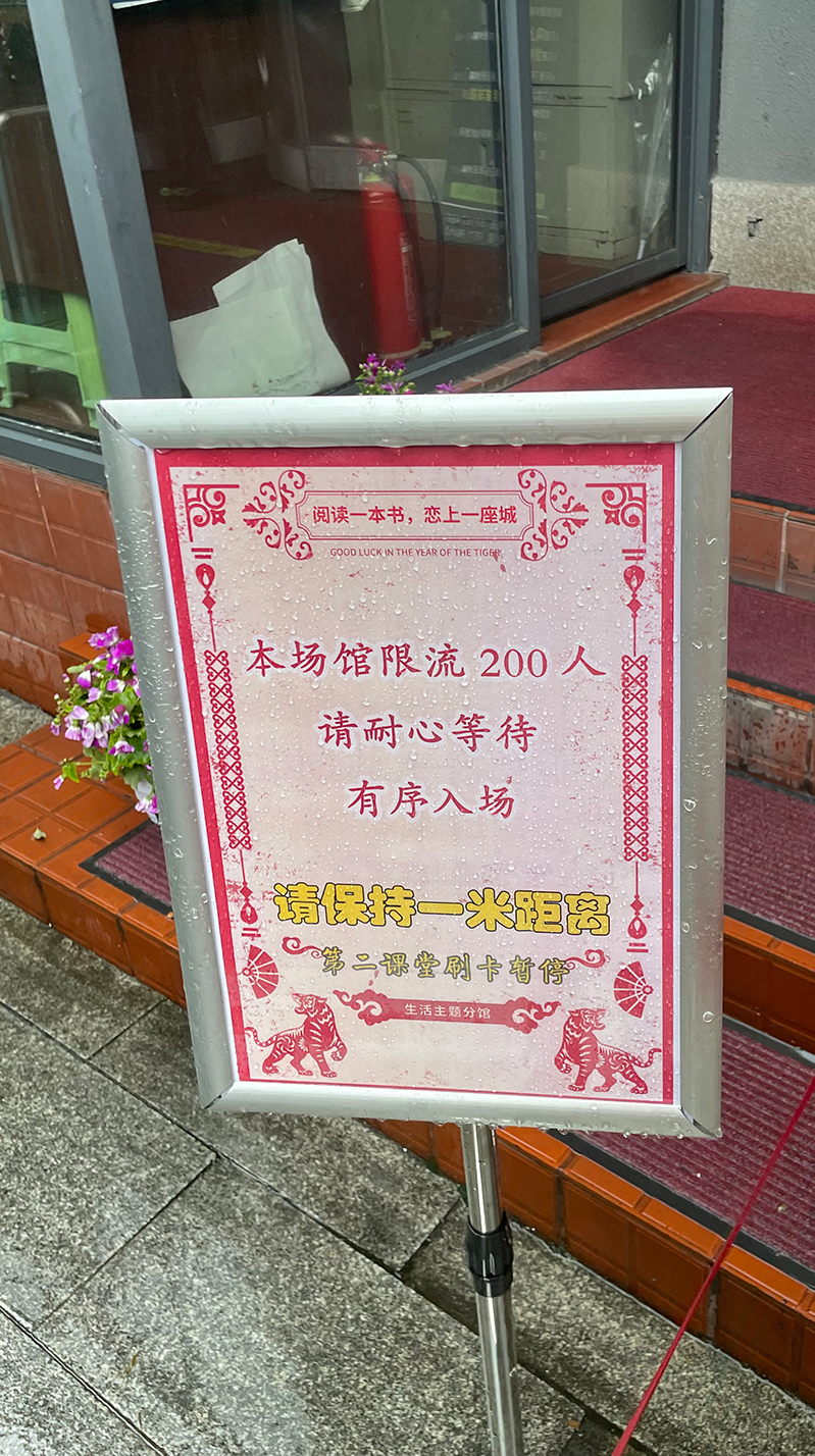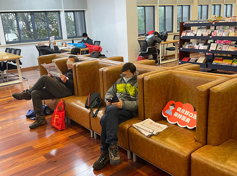 位于杭州市上城區浣紗路的杭州圖書館(生活主題分館)門口有一告示牌,上面清楚地寫著“限流200人”。在該圖書館入口和出口處,均有1名保安負責檢查讀者的健康碼和行程碼。市民進出圖書館時,需要通過刷身份證、市民卡或者手機預約等方式簽出簽退,在館人數可實現實時更新。同時,圖書館內還張貼著標語,提醒人們佩戴口罩。不過,館內仍有個別讀者在閱讀時將口罩摘下。