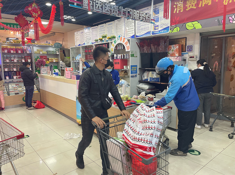 在超市門口,還有不少包裝好的蔬菜被放在送貨上門服務點。有了外賣騎手的辛勤付出,老百姓們足不出戶也能完成采購。