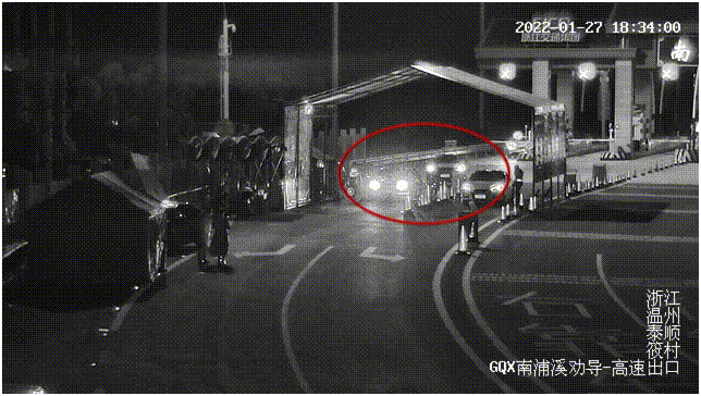 1月27日18時30分,在泰順南浦溪高速口防疫點,一輛黑色轎車駛出收費站,緩緩向防疫點駛來,而此時防疫點的工作人員正在開展防疫檢查工作。