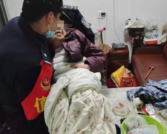 “我扶你起來,到床上去好不好?”等待醫護人員到來的過程中,民警怕老人在地上受涼,將其轉移到了床上并蓋好棉被。