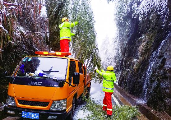 2月4日,受雨雪天氣影響,金華婺城區箬陽鄉大應村路段,金華山羅電線盤前村附近公路路面積雪結冰,道路兩邊一些毛竹、樹木枝條被雪壓折。婺城公路養護員工放棄春節休息,組織應急搶險隊攜帶掃雪機、撒鹽機等設備物資上山,清理路面積雪路段,砍掉倒伏在路面上的毛竹、樹木枝條,保障山區公路安全暢通。(時寬兵)