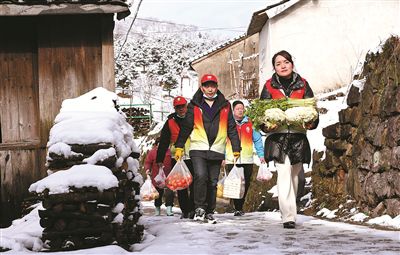 志愿者踏雪送菜。余建文攝