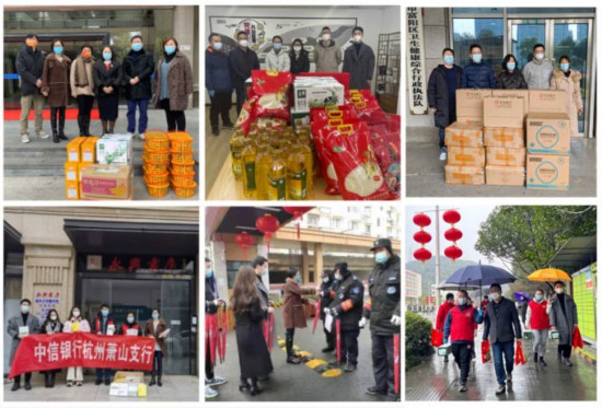 中信銀行杭州分行下轄蕭山支行、富陽支行等機構員工在堅守崗位保障金融服務的同時,還主動奔赴一線,向醫療服務機構和多個街道捐贈防疫物資和生活物資。向當地衛生健康局捐獻暖寶寶、醫用口罩等抗疫物資;向24小時待命的街道工作人員送去慰問和新春祝福;與社區工作者一起挨家挨戶為居民送上新年禮包;前往多個社區卡口,為風雪中堅守的工作人員送去雨傘;為隔離酒店的安保人員和隔離人員配送充電線、毛巾禮盒、中信出版社的書籍、毯子等補給物資;并向街道圖書館捐贈圖書,由街道統一調配給隔離居民,豐富居民的精神生活。