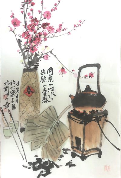 樂叔說,沒想到短短一天,朋友們就幫他找到了這位“天使”。為了表達謝意,他在尋找過程中就已經創作了兩幅冬梅圖。一開始以為那位醫護人員是胡小娟,他就創作了《嫩寒春曉》!半m然最后發現幫我做核檢的不是她,但我一樣感恩,她們都是無私奉獻來援富的醫護人員,這幅畫我依然要送給她!睒肥逭f。確定幫他做核酸檢測的是王翌后,他又創作了《同煮一江水 共飲一壺春》。