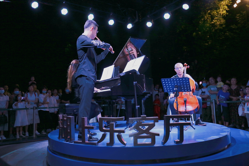 市民游客們還可在南宋“臨安城”與現代杭州之間“穿梭”:湖濱步行街上,以小提琴、五線譜、金色音符“拼湊”出的大型墻面燈光秀,讓人在西湖畔也可漫步“維也納金色殿堂”,享受一場燈光“盛宴”。