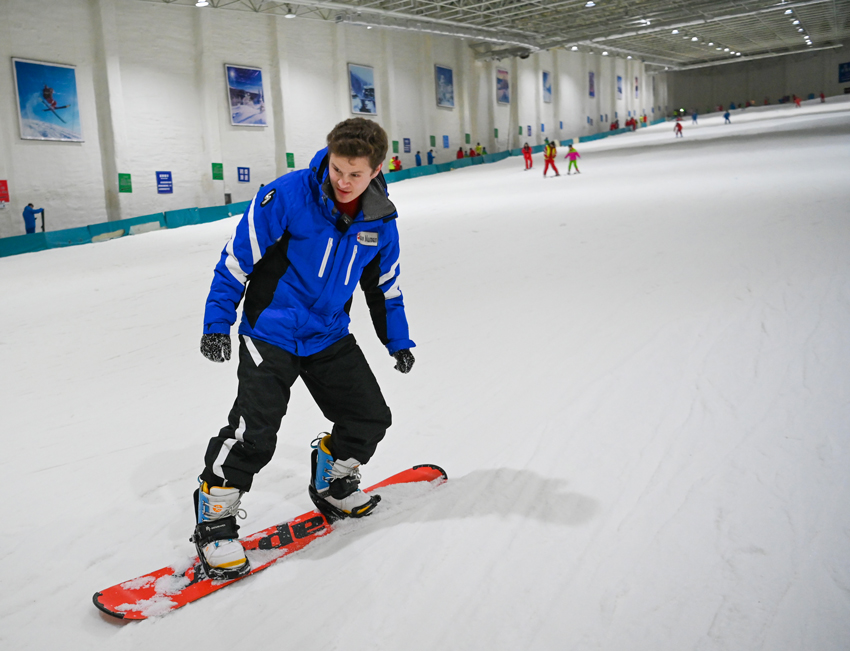 “別緊張,深呼吸,雙腿屈膝,重心壓低……”在文成天鵝堡室內滑雪場,在教練的指導下,Akmal進行單板滑雪體驗!拔覐男【头浅O矚g滑雪和滑冰,刺激的運動總是容易讓人開心!盇kmal說,“2月14日的北京冬奧會也正在進行自由滑雪和單板滑雪的賽事,對我個人而言,單板滑雪是第一次體驗,感覺比雙板滑雪更刺激更酷,真的非常棒!