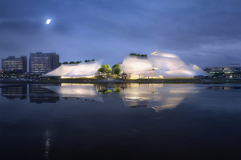 義烏大劇院項目是金華市2022年開工重點項目之一,總用地4.7萬平方米、總建筑面積10.97萬平方米,主要包括劇院和會議廳兩部分。義烏大劇院以“帆、檐、綢、山”為靈感,形成斜置片狀玻璃表皮頂,半透明玻璃材質賦予屋頂絲綢的質感。從遠處看去,半透明玻璃屋頂又成了帆船上的帆,宛若一葉輕舟漂浮在水面上。項目建成后將健全公共文化產品和服務供給體系,成為義烏下一個文化地標。