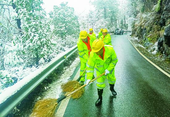 2月17日,雨雪天氣導致湖大線金華婺城區箬陽鄉線南坑口村至大應村路段路面積雪,婺城交投蘇孟公路養護站應急搶險隊立即組織隊員,上山清理路面積雪,消除安全隱患,保障山區道路暢通。(時寬兵)