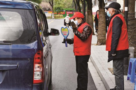 2月19日,在嘉興市南湖區新嘉街道西馬橋小區門口,冷風中,志愿者胡師傅(左)為進入小區的市民測量體溫,檢查健康碼、行程卡。胡師傅告訴記者,2022年春節以來,他一直堅守在崗位上,一天也沒有落下,希望通過守好“小門”,給鄰居們帶來安全感。(張啟帆)