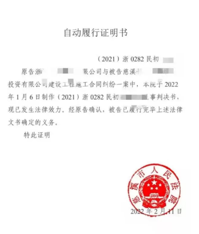 為激勵投資公司的自動履行行為,景贊宇根據自動履行正向激勵機制,向投資公司發送了《自動履行證明書》。在以往的執行案件中,被執行人作為被強制執行的對象后,會對其征信產生不利的影響,而有了《自動履行證明書》后,銀行對于具有較高誠信度的被執行人,可根據《自動履行證明書》,視情恢復其信用等級,從而推進相關業務的辦理,讓公司可以充分享受到誠信履行帶來的司法紅利。