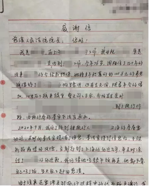 收到款項后,汪阿姨的女兒周女士寫了一封感謝信,另定制了一面錦旗,一并寄送到了慈溪法院。周女士在信中表示,這筆錢是母親多年的積蓄,這幾年錢拿不回來,母親一直為此發愁,“我們全家發自內心對執行局李法官表示感謝,同時也十分感謝慈溪法院其他的立案、訴訟的有關法官……”信中,周女士對李法官表示了滿滿的感激之情。