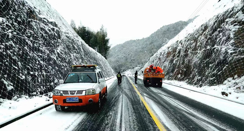 為保持道路暢通,泰順縣還建立應急聯動勤務機制,配備編織袋1.8萬個、融雪工業鹽50噸、警示牌300多個,啟用撒鹽車、養護作業車等機械設備,對積雪路段進行鏟雪作業,截至2月21日10時,共出動養護保暢人員近100人次、撒鹽約8噸。