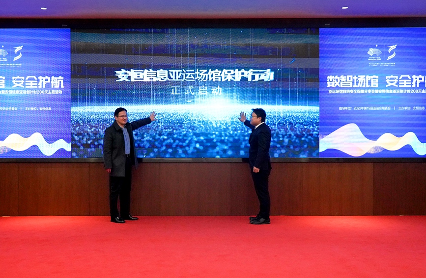 人民網杭州2月23日電 (張麗瑋)今天,杭州亞組委廣播電視和信息技術部副部長趙欣浩與安恒信息高級副總裁袁明坤共同啟動了“亞運場館網絡安全保護行動”。