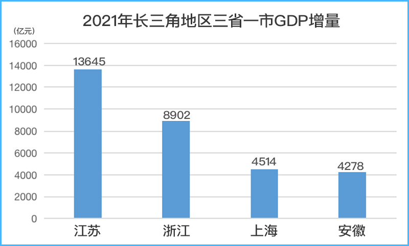 2021年長三角地區三省一市GDP增量。數據來源:各地統計局官網。制圖:秦文