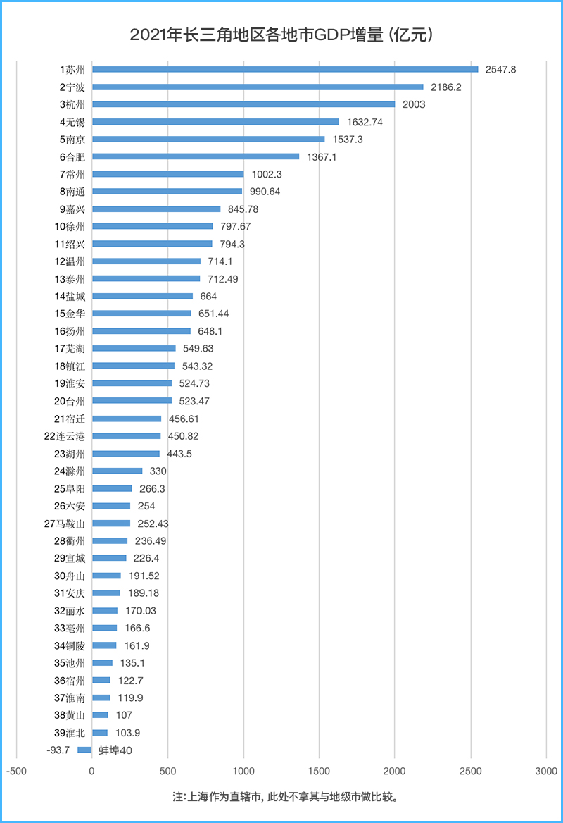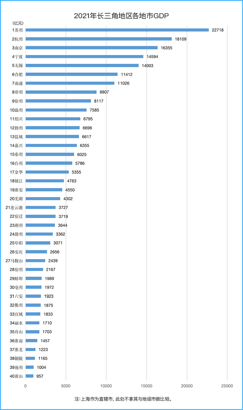 該榜單前十名中,寧波、無錫、合肥和南通也是“萬億俱樂部”成員,常州、徐州、溫州的經濟總量則在9000億元以下,離萬億目標尚存一定差距。在長三角40個地級市中排名最末的黃山,2021年GDP為957億元,按照其增長速度,2022年將有很大概率邁上千億元臺階,屆時長三角將進入“全體千億市”的新局面。