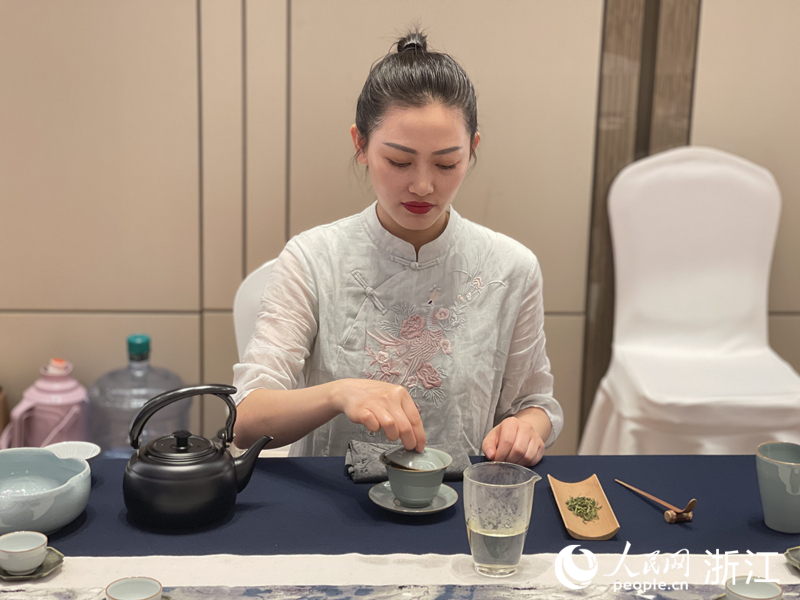 茶藝師現場沖泡開化龍頂茶。人民網 王蕭蕭攝