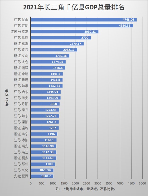 近日,長三角各縣(市)2021年主要經濟數據相繼發布,2021年GDP突破1000億元的千億縣名單也陸續出爐。據人民網浙江頻道統計,2021年長三角新增兩個千億縣,總數達到27個(除去市轄區),GDP總量達4.2萬億元,以不到全國陸地國土面積的0.4%,貢獻了全國3.71%的GDP。