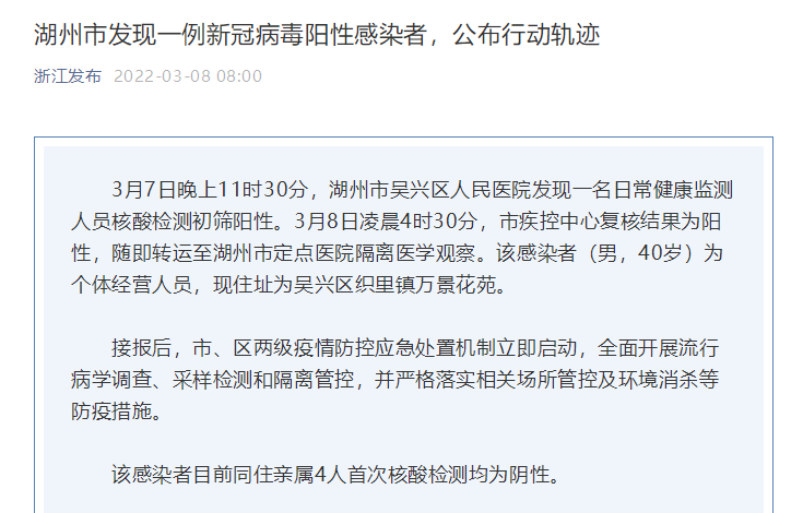 3月7日晚上11時30分,湖州市吳興區人民醫院發現一名日常健康監測人員核酸檢測初篩陽性。3月8日凌晨4時30分,湖州市疾控中心復核結果為陽性,隨即轉運至湖州市定點醫院隔離醫學觀察。該感染者(男,40歲)為個體經營人員,現住址為吳興區織里鎮萬景花苑。