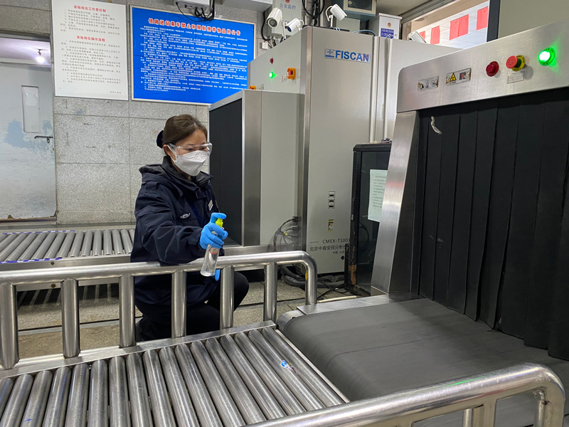 溫州站安檢口,工作人員正在對安檢儀進行消毒。范凡攝