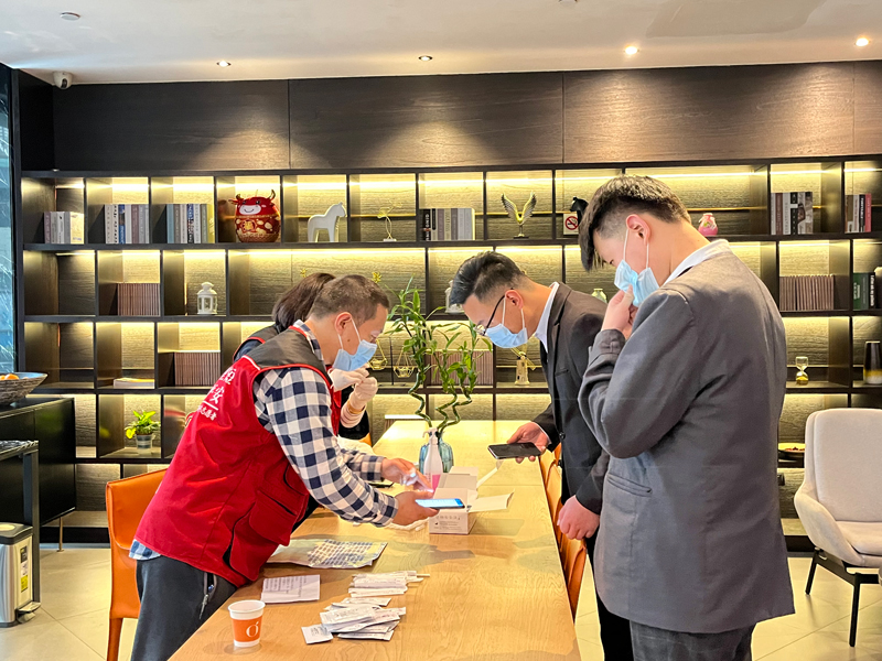 另一邊,武林“店小二”也在積極行動,為企業、賓館、樓宇等轄區單位送上貼心服務,不僅將抗原檢測試劑分發到每位員工手上,還現場演示使用方法!霸跍蕚渥詼y前,一定要保持手部干凈,用酒精消毒……”在某企業,武林“店小二”阮峰、費晶晶正在為員工講解自測步驟,企業員工在他們的引領下規范完成了抗原檢測。據悉,連日來,共有20名武林“店小二”實地進入18家單位,協助企業員工完成抗原檢測。
