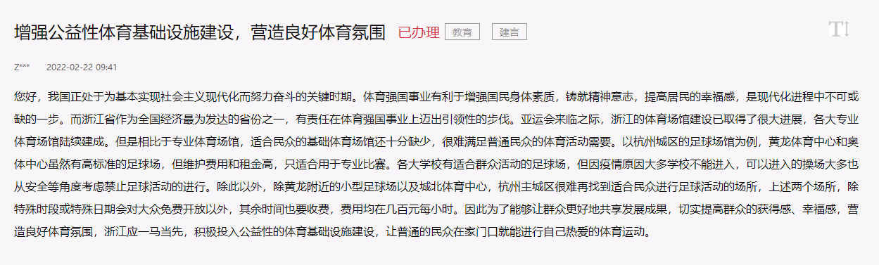 近日,網民在人民網“領導留言板”留言:亞運會來臨之際,浙江的體育場館建設已取得了很大進展,各大專業體育場館陸續建成,但是相比專業體育場館,適合民眾的基礎體育場館少、收費貴,很難滿足普通民眾的體育活動需要。