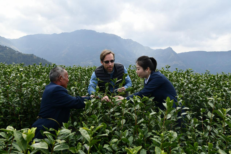 “以前對茶葉的制作過程并不了解,今天真的增長了很多見識!弊哌M茶園深處,在茶農的指導下,西蒙化身采茶工,穿梭于茶壟之間!霸谶@之前我還沒有見過茶樹的生長和采摘,今天在茶園里見到的茶樹和我想象的很不一樣,一整片非常整齊,令人震撼。采摘也非常有趣,和我之前體驗過的農耕活動都不同,很有特色!蔽髅烧f。