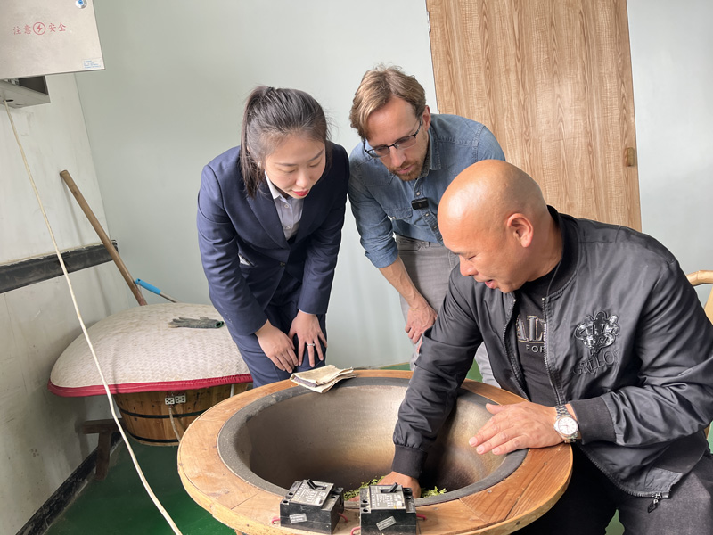 在參觀了機械制茶工序后,西蒙一行還跟隨蔡永游體驗了一回手工制茶。