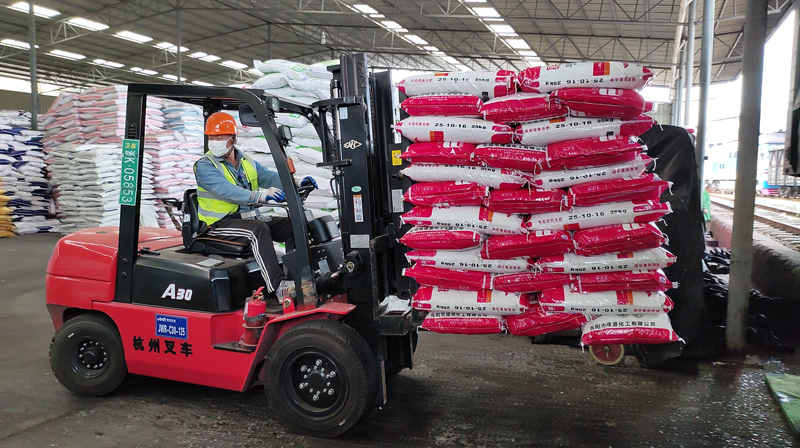 麗水經營部叉車正在卸化肥。韓金峰攝