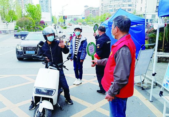 4月5日,在金華婺城區城東街道通園路社區各暖心服務點、小區出入口,管理人員落實測溫、亮碼、戴口罩的要求,“場所碼”逢進必掃,社區自行設計了便攜式“掃碼桿”。使用“掃碼桿”后,過往車輛和行人掃碼的效率明顯提高,縮短了通過時間,拉開了志愿者和來往車輛及人員的距離,避免人員接觸。(時寬兵)