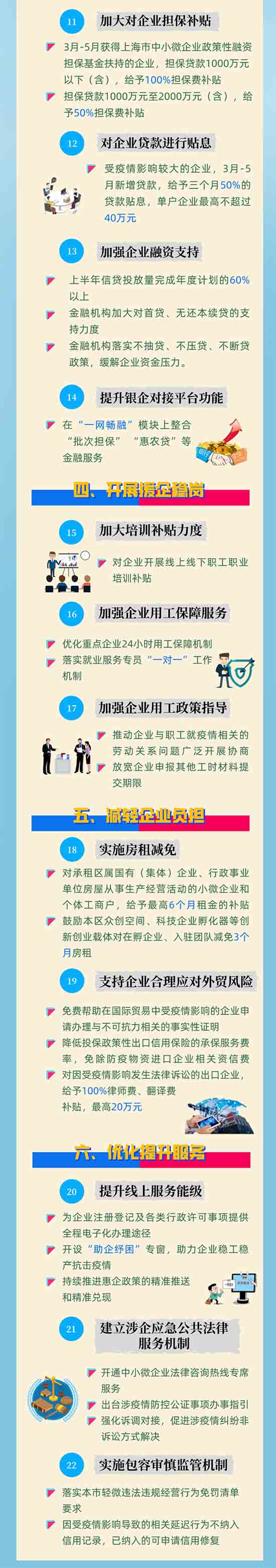 據悉,為統籌好疫情防控和經濟社會發展,全力幫助市場主體克服困難、恢復發展,在全面落實好國家、上海市退稅減稅、降費讓利、房租減免、財政補貼、金融支持、援企穩崗等助企紓困政策的基礎上,結合金山實際,進行擴圍升級,制訂《金山區抗擊疫情助企發展22條政策措施》!22條”既聚焦企業當前面臨的“難點”“痛點”“堵點”,又考慮到疫情后企業加快發展的各項訴求,共計包括六大方面內容,即支持打贏疫情防控阻擊戰、精準實施行業紓困、強化金融保障、開展援企穩崗、減輕企業負擔及優化提升服務,用實實在在的舉措,精準幫助市場主體紓困解難,穩定經濟增長。