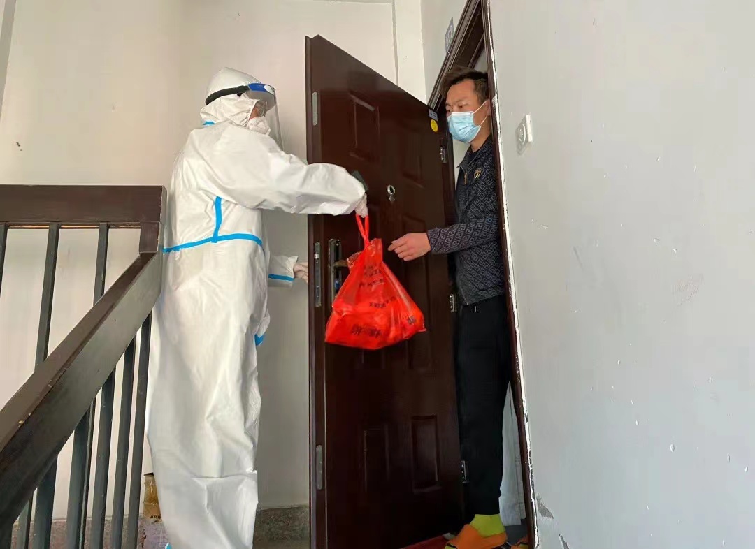 “我還有6戶,你呢?”“我只有3戶了,幫你拿點吧!眱蓚“大白”喘著粗氣爬上6樓,相互交流著手里物資的配送情況。