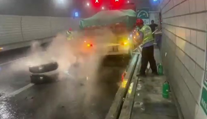 22點3分,巡查員通過對向隧道的汽通門第一時間進入現場,施救人員從同向到達現場,一次“雙向奔赴”的救火就此展開。一名巡查員與施救人員緊密配合,拿出水槍,對著起火點進行滅火。不出2分鐘,起火點的明火被熄滅,但是溫度還是很高,需要不斷澆水才能阻止輪胎復燃。另一名巡查員則將司機帶離到安全地帶,隨后又將車道上的雜物清理至緊急停車帶,以便解除卡口后為后續車輛提供一個安全的行車環境。22點23分,車道恢復暢通。