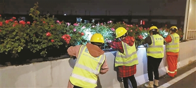 “結合常規巡查,新增加負責人、管理員、班組三級巡查模式,通過車巡看整體、人巡觀細節,檢查市管高架綠化全域路線,分別做到每月、每半月、每兩天一次全覆蓋,對于高架主線和重點匝道做到每天巡查!焙贾菔谐枪芫质姓行南嚓P負責人介紹,2022年的“高架花廊”巡查主要以綠化長勢、灌溉情況、病蟲害、排水設施滲漏等內容為主,對隱患問題第一時間發現,第一時間處理。