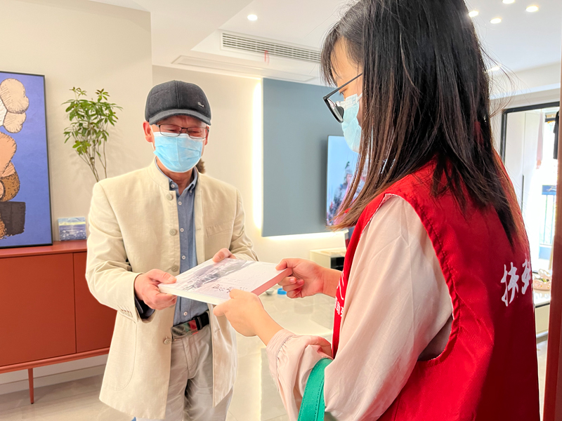 織里鎮殘聯工作人員上門為殘障人士湯新林送上《淡去的炊煙》。倪莉萍攝