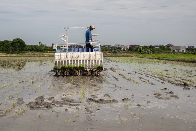 慈溪市橫河鎮秦堰村農戶正在使用無人駕駛智能插秧機進行工作。沈建國攝