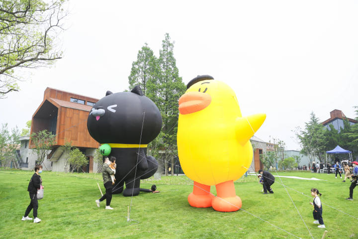 5月3日,嘉興桐鄉市民陳曉霞抓住假期的尾巴,帶著孩子來到烏鎮·有戲FUN打卡,一腳踏進園區,看著前面站立著兩個巨型玩偶,4歲的寶寶開心地飛奔起來!皟鹤,它們倆是烏鎮寶寶,名字叫烏力貓和烏鴨丫!笨粗⒆右荒槧N爛笑容,陳曉霞心想,總算是來對了地方。