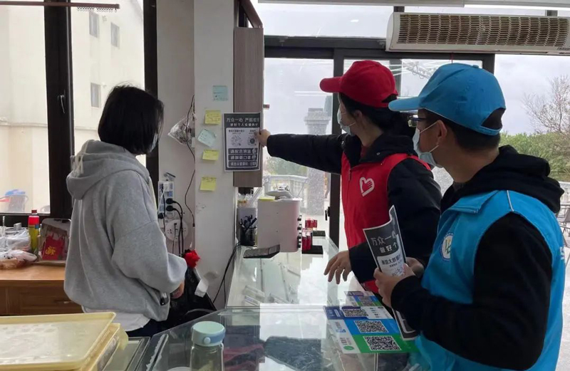 普陀山鎮合興社區網格員在超市分發社區自制的疫情防控宣傳單。江海平攝