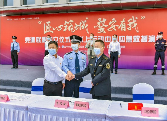 成立儀式上,“匠心筑城·婺安有我”黨建聯盟正式簽約授牌,并開展水上運動中心應急救援演練,發揮聯盟優勢推動平安建設。